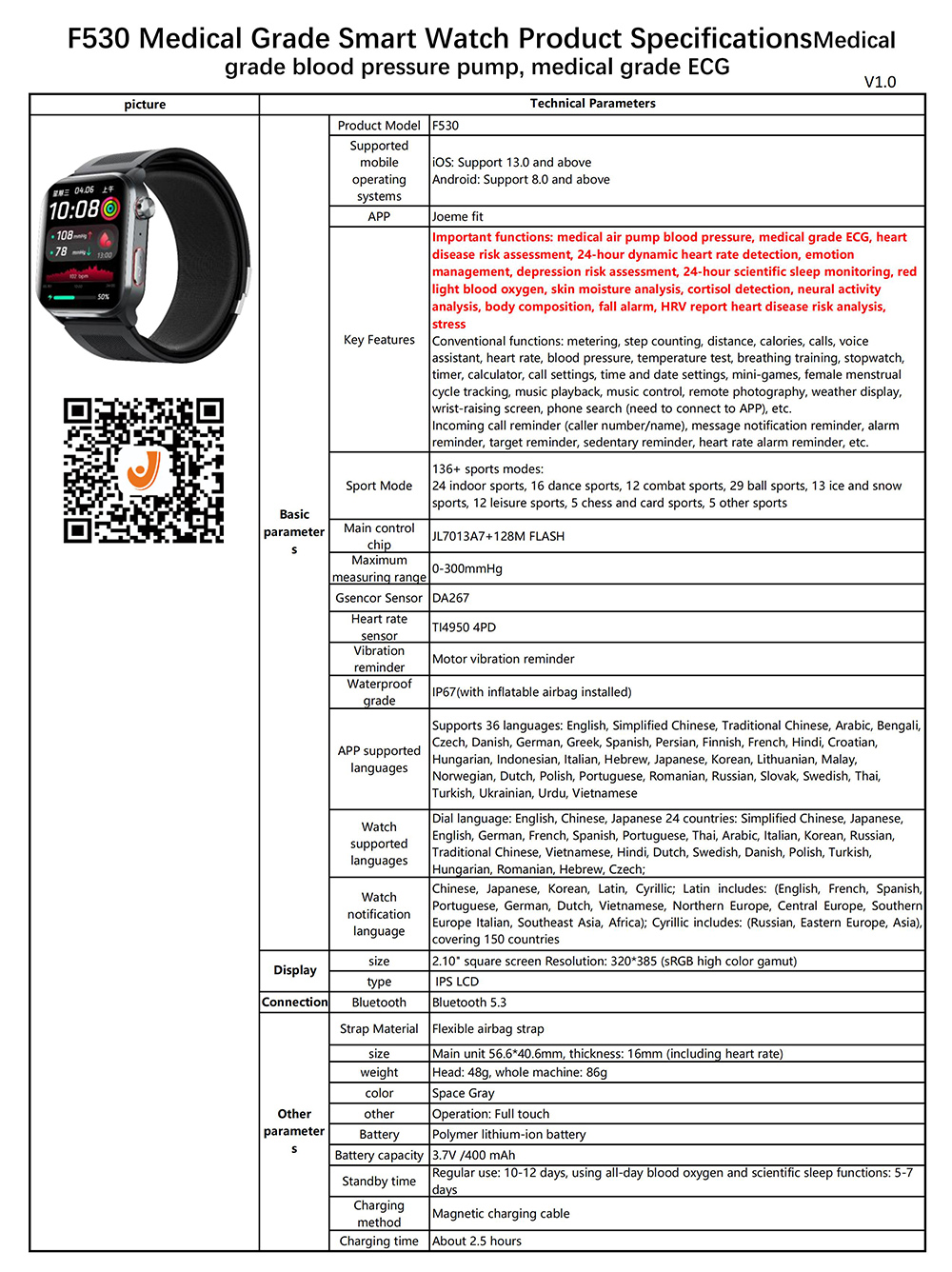 Important functions: medical air pump blood pressure, medical grade ECG, heart disease risk assessment, 24-hour dynamic heart rate detection, emotion management, depression risk assessment, 24-hour scientific sleep monitoring, red light blood oxygen, skin moisture analysis, cortisol detection, neural activity analysis, body composition, fall alarm, HRV report heart disease risk analysis,stress