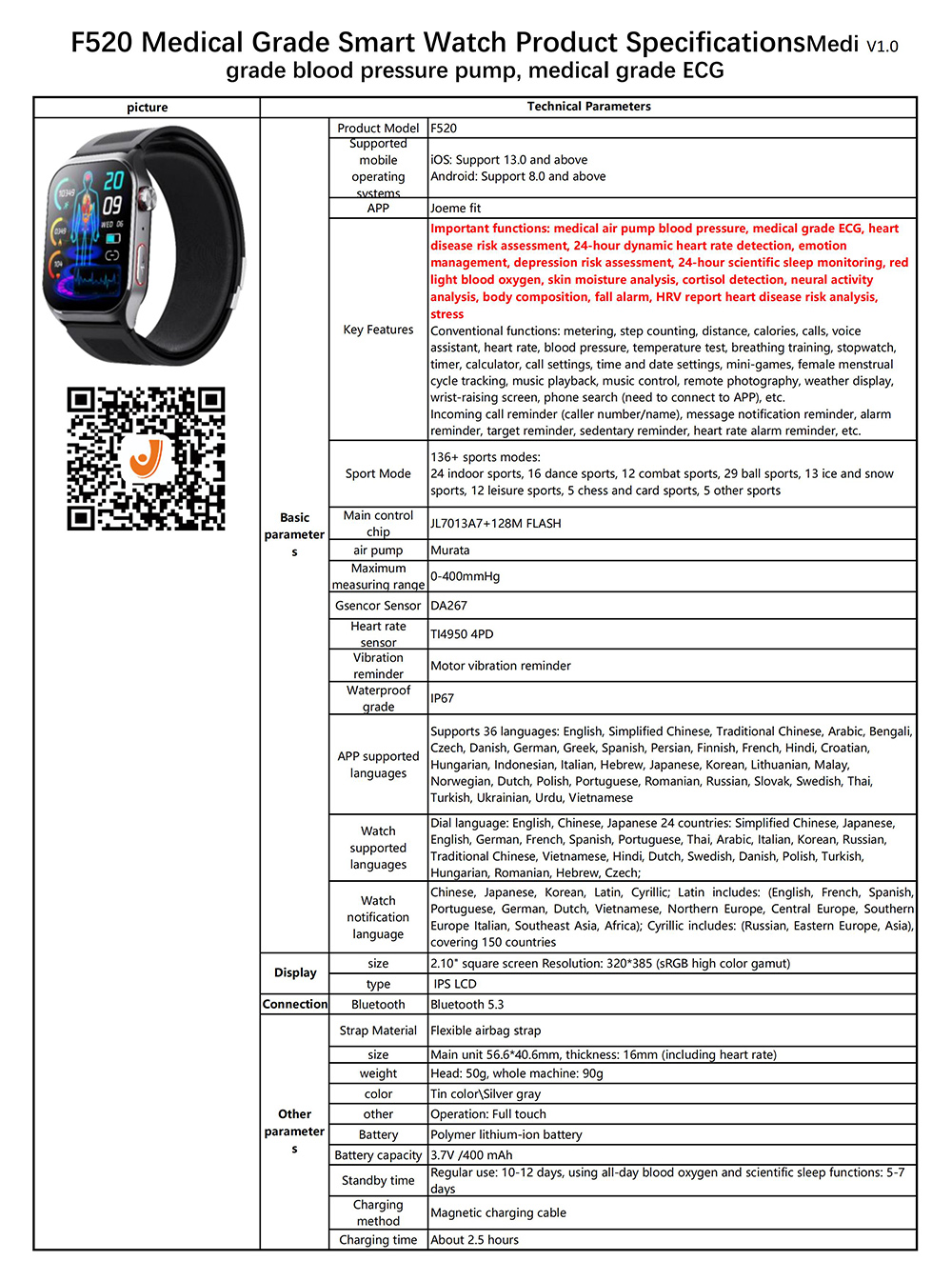 Important functions: medical air pump blood pressure, medical grade ECG, heart disease risk assessment, 24-hour dynamic heart rate detection, emotion management, depression risk assessment, 24-hour scientific sleep monitoring, red light blood oxygen, skin moisture analysis, cortisol detection, neural activity analysis, body composition, fall alarm, HRV report heart disease risk analysis,stress