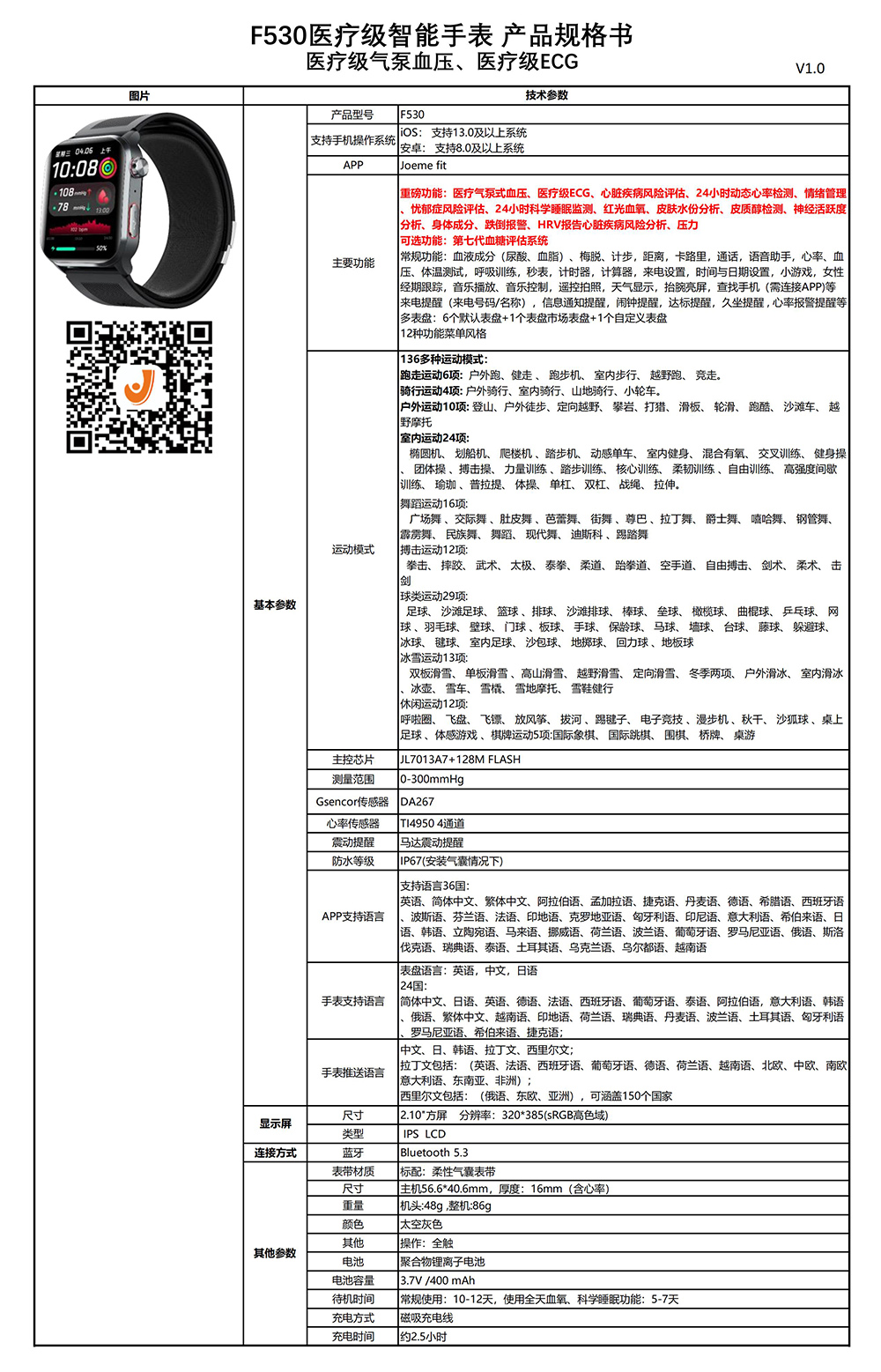 重磅功能:医疗气泵式血压、医疗级ECG、心脏疾病风险评估、24小时动态心率检测、情绪管理、忧郁症风险评估、24小时科学睡眠监测、红光血氧、皮肤水份分析、皮质醇检测、神经活跃度分析、身体成分、跌倒报警、HRV报告心脏疾病风险分析、压力。